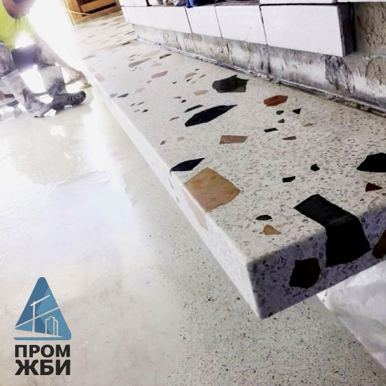 Подоконники терраццо изготавливают из особого состава, частично напоминающего традиционный бетон. В качестве связующего компонента там так же выступает портландцемент – серый или белый, в массу вносят улучшающие эксплуатационные качества добавки, но типы наполнителя отличаются. Чаще всего это крошка и щебень горных пород, отличающихся привлекательным внешним видом и ярко выраженным цветом. После застывания сформированных изделий, их поверхность шлифуют до гладкости, иногда полируют до блеска.